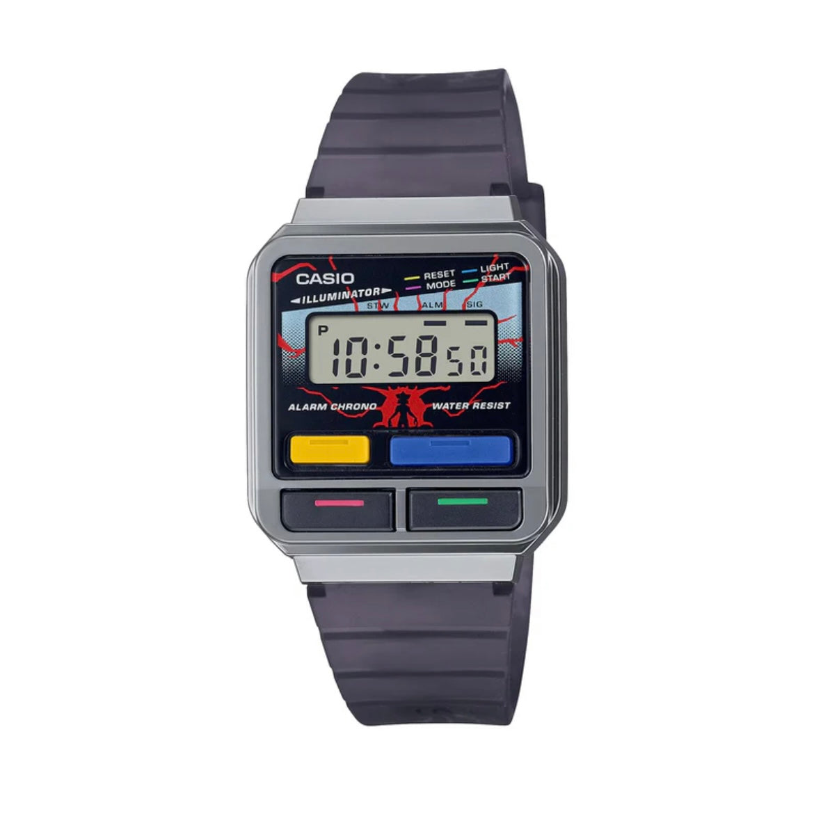 This new Stranger Things A120 design incorporates the multi-color Casio designs of the 1980s in a nod to the Upside Down, the mysterious alternate dimension that exists in parallel to the human world in the show. The watch face depicts the world of the show, with pop, colorful front buttons reminiscent of the 1980s and the underworld creature demogorgon in silhouette as it appears in small town America. Press the LED light button to reproduce the blinking light effect when the demogorgon surfaces and reveal the title printed upside down, further evoking the alternative dimension. Vines reach across the case back and translucent band in a reminder that this world and the underworld are closely linked.