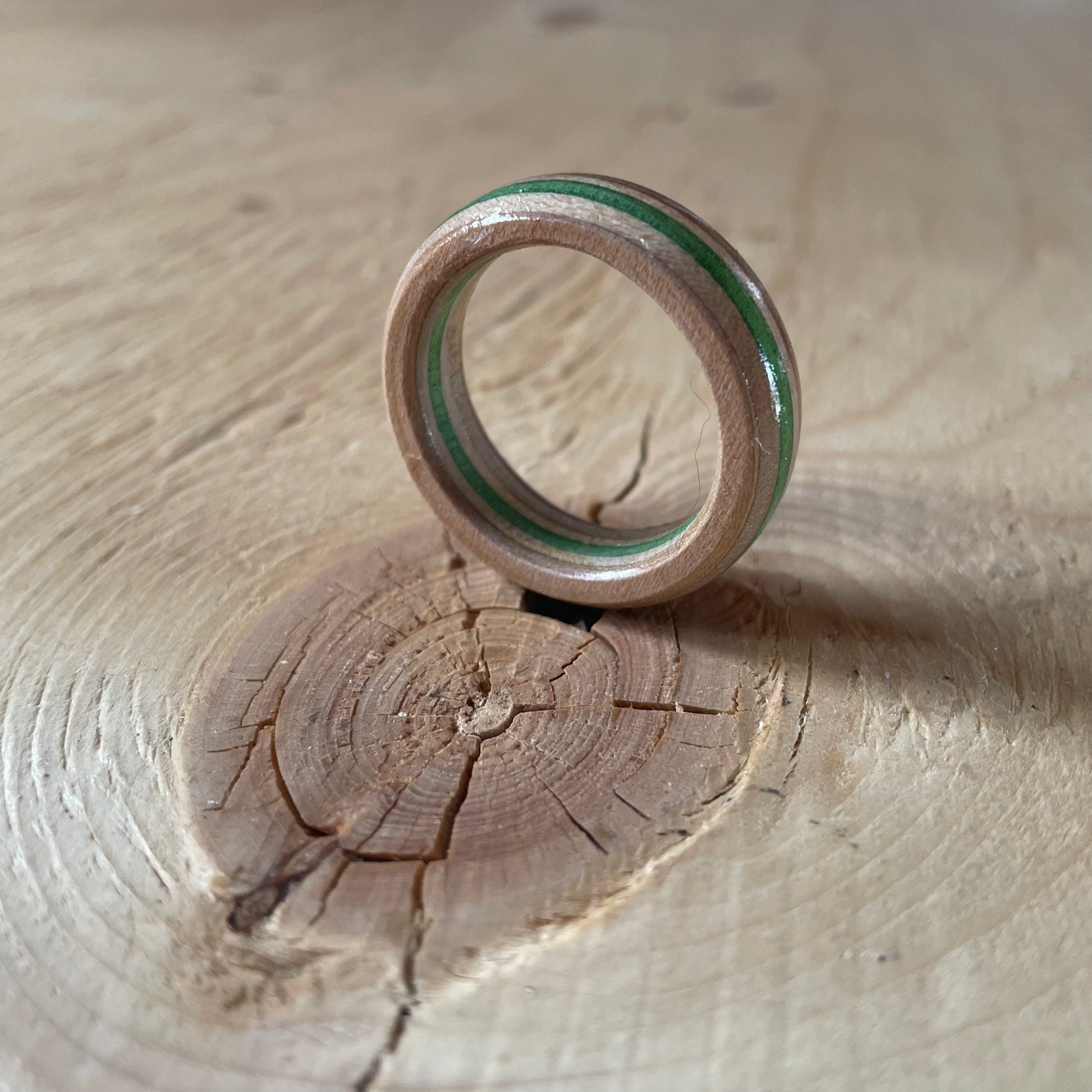 A recycled skateboard ring handmade in Gananoque, Ontario by Deckwear.