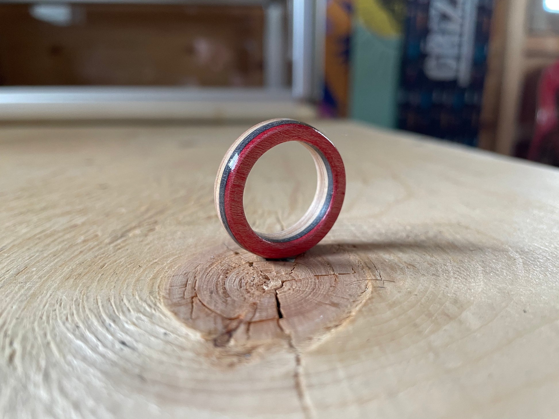 A recycled skateboard ring handmade in Gananoque, Ontario by Deckwear.