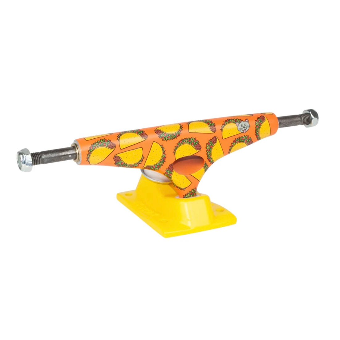 It's Taco Cat Tuesday every day with the Krux Taco Truck. Matte orange hanger with graphic water decal, matte yellow baseplate, silver hardware, and white cushions.