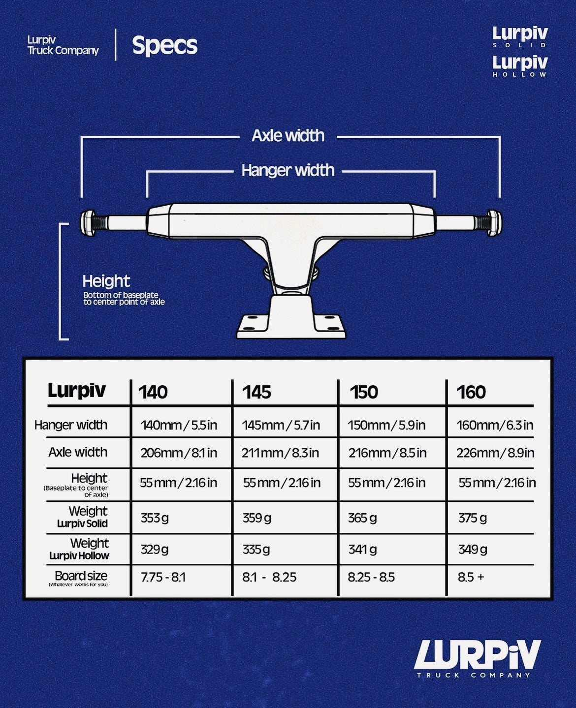 Hollow hanger and axle, standard 92A yellow bushings. Designed in Sweden. All LURPIV trucks are injected NOT gravity poured for premium quality.