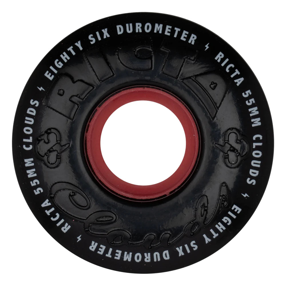 Ricta Wheel Dynamics 55mm Clouds Red 86a black with red core, debossed and pad printed lettering. Medium-soft urethane for filmer setups, skating ditches and rougher terrains.